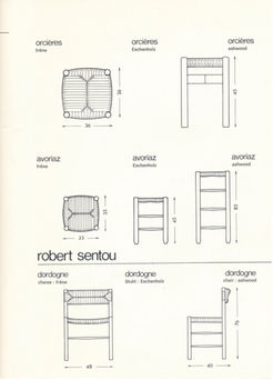 Au sortir de la Seconde Guerre mondiale, la France est un pays exsangue. Le mouvement de la Reconstruction, en participant activement au relogement des populations en zone sinistrée, engage la France sur la route du progrès et de la modernisation. Cette période offre de formidables opportunités aux architectes, décorateurs, fabricants, de faire entrer la Modernité dans tous les intérieurs. Sentou sut profiter de cet élan national pour ouvrir successivement deux ateliers de fabrication de sièges dans le Périgord. Le savoir-faire traditionnel et la production locale furent rationnalisés pour fournir en série les sièges meublant les nouveaux appartements tout juste sortis de terre. Robert Sentou participe rapidement au Salon des Arts ménagers – qui a rouvert ses portes au Grand-Palais dès 1948. Du Périgord à Paris, Robert Sentou côtoie de nombreux architectes. Ceux-là mêmes qui participeront par la suite au deuxième grand mouvement d’aménagement du territoire national, celui des lieux de villégiature. C’est à cette occasion que Robert Sentou commence à fabriquer les sièges de Charlotte Perriand, puis finalement à les éditer après le retrait de Steph Simon. Mais l’édition est une autre aventure! [Dans les années 1960, Charlotte Perriand a sollicité Robert Sentou pour lui confier l’édition des sièges destinés à l’ameublement des stations de ski qu’elle équipait. Nos fauteuils ont été conservés par Robert Sentou, comme étalons, dans le fonds d’archives Sentou, et l’un a été présenté dans le cadre de l’exposition des 70 ans de Sentou, en 2017.]